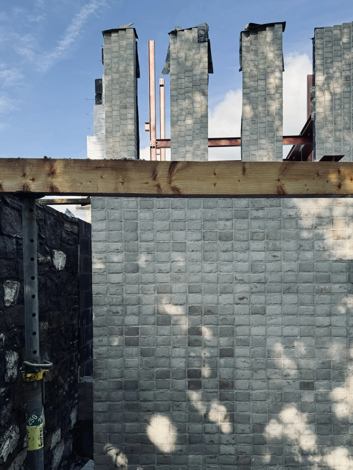 Striking a balance between the stone and brick context, walls are constructed in a naturally toned off-white clay brick. Each brick is laid as a stack-bonded stretcher oriented with the length of the site, revealing stack-bonded header faces at front and rear elevations.