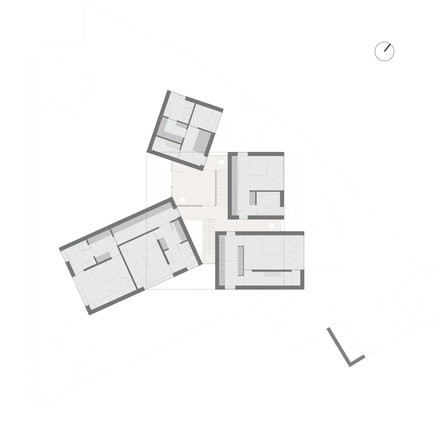 The concept aims to strategically orient each volume to maximize natural light, views, and green spaces, while maintaining a cohesive relationship with the surrounding houses.
