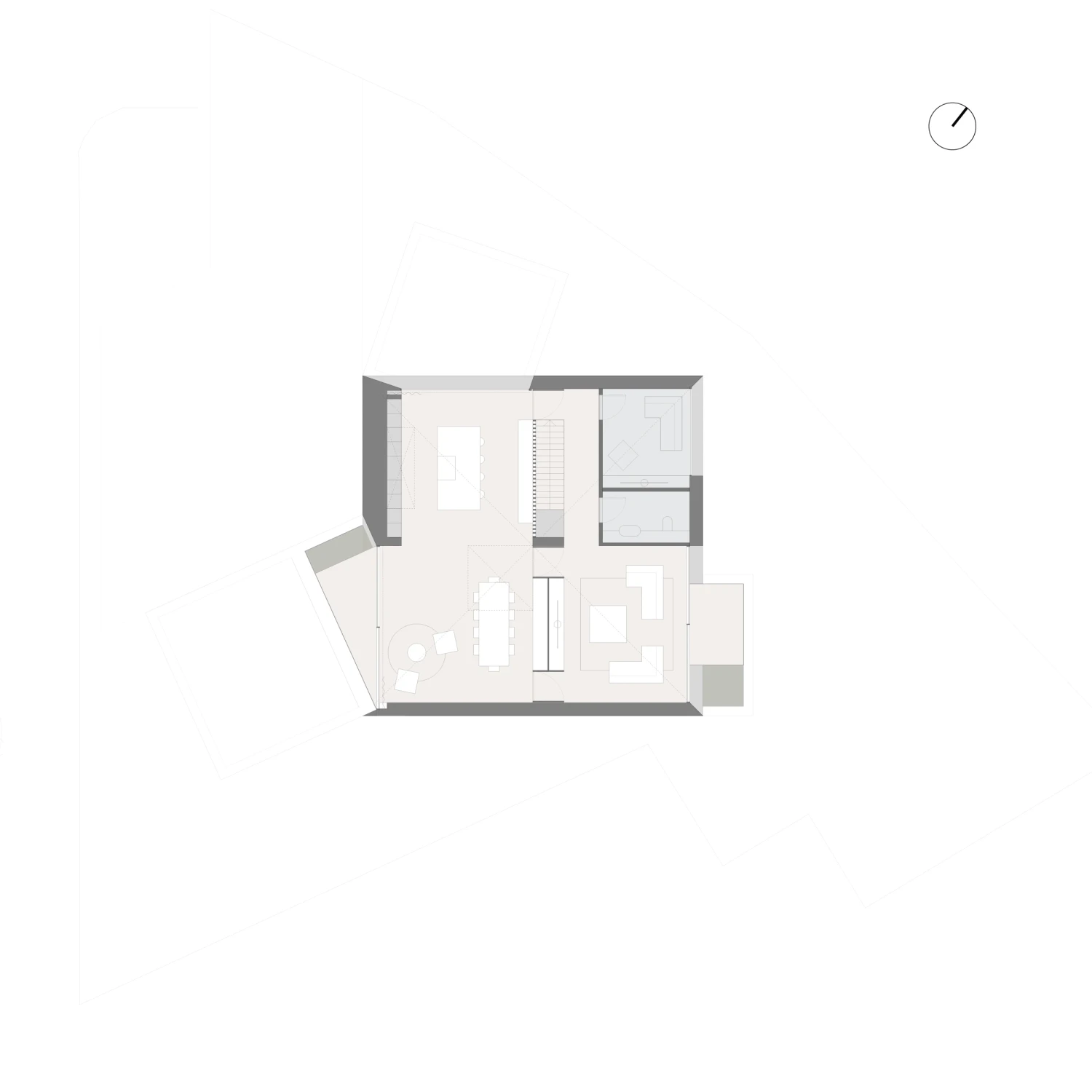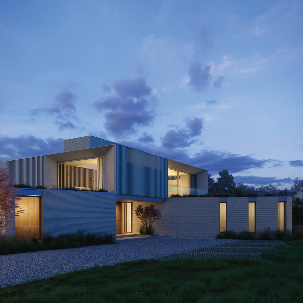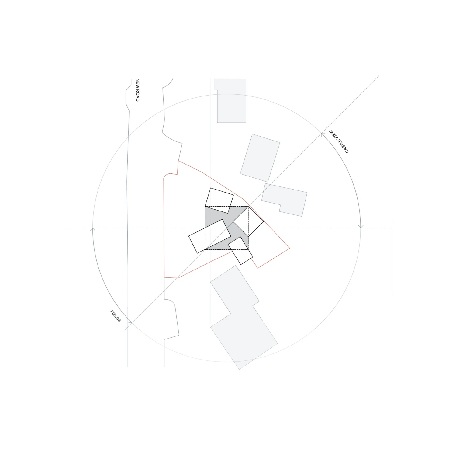 A dwelling that responds thoughtfully to its irregular site, an old junction of fields, embracing and responding to the unique shape. Ground floor volumes twist and turn to boundaries and neighbouring dwellings to capture private pockets of garden between distinct building wings, while the first floor maintains the established building line of the rural road.